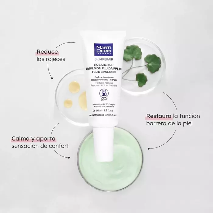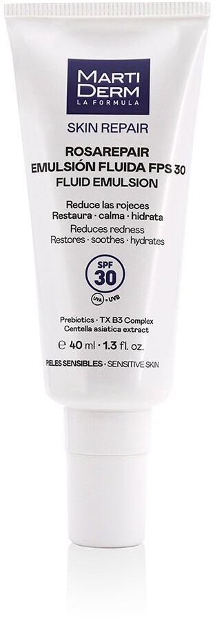 Жидкая эмульсия Martiderm SKIN REPAIR ROSAREPAIR Fluid Emulsion SPF 30, 40 мл — это идеальное средство для защиты и восстановления кожи, особенно для чувствительной и склонной к покраснениям. Она обеспечивает надежную защиту от солнечных лучей благодаря SPF 30 и помогает улучшить внешний вид кожи.