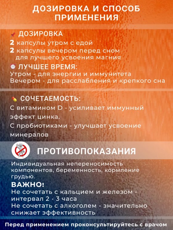 • Поддержка иммунной системы: Цинк играет важную роль в поддержании иммунной функции, помогая организму бороться с инфекциями.